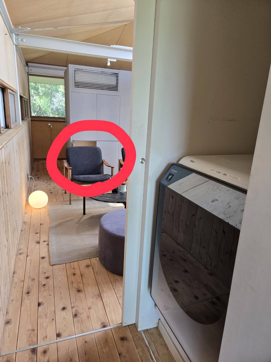 洗濯用洗剤と柔軟剤は赤丸で囲まれた棚の中に置いていますのでご利用ください。