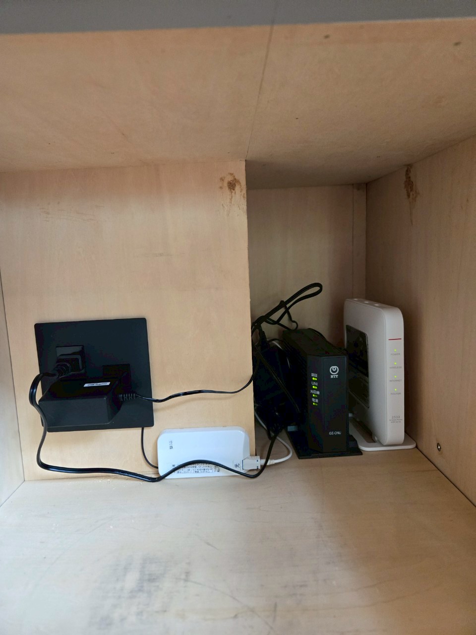 下の画像の場所にルーター・モデムがあります。両方とも電源を抜いてください。その後、モデムから電源を入れていただき、5分後にルーターの電源を入れてください。