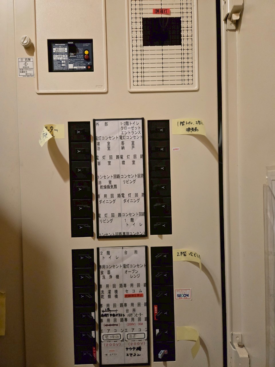 使用量がオーバーしてしまった可能性があります。1Fリビングのソファー横倉庫にブレーカーがありますのでご確認ください。「OFF」になっているブレーカーを見つけたら、「ON」に戻します。