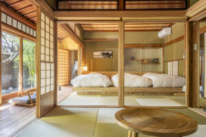 広い玄関や中庭が見える家の造り・離れの寝室など、まるで旅館にいるような心地よさを感じます。