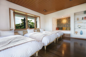 Izu Kogen is a place rich in nature. It has a terrace and a large private dog run, with an endless sky and ocean view in front of you. On a clear day, you can even see Izu Oshima Island. After a full day of play, you can enjoy the natural hot spring water in the large stone bath to your heart's content. At night, enjoy a BBQ on the terrace under the stars.