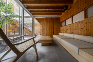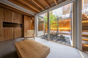 山恒 氏によって設計された当宿は、家の中心に位置するガラス張りの中庭を囲うように各部屋が配置されているため、一般的な家庭とは全く異なる非日常の生活を体験できます。