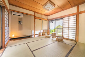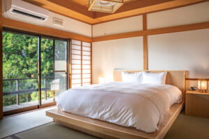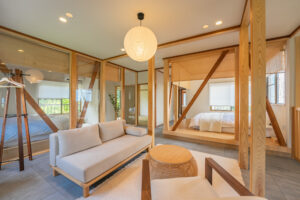最大15名様までご一緒にお泊まりいただける大きな日本家屋です。重厚な外観やお庭に日本らしさを感じさせながら、ラウンジと客室を備える2Fスペースやプライベートサウナ、BBQが楽しめるガーデンテラスなど充実の設備も魅力となっています。2F客室からは富士山から広がる伊豆半島の付け根の街並みを一望することができ、1日の中で様々な表情の風景を楽しむことができます。