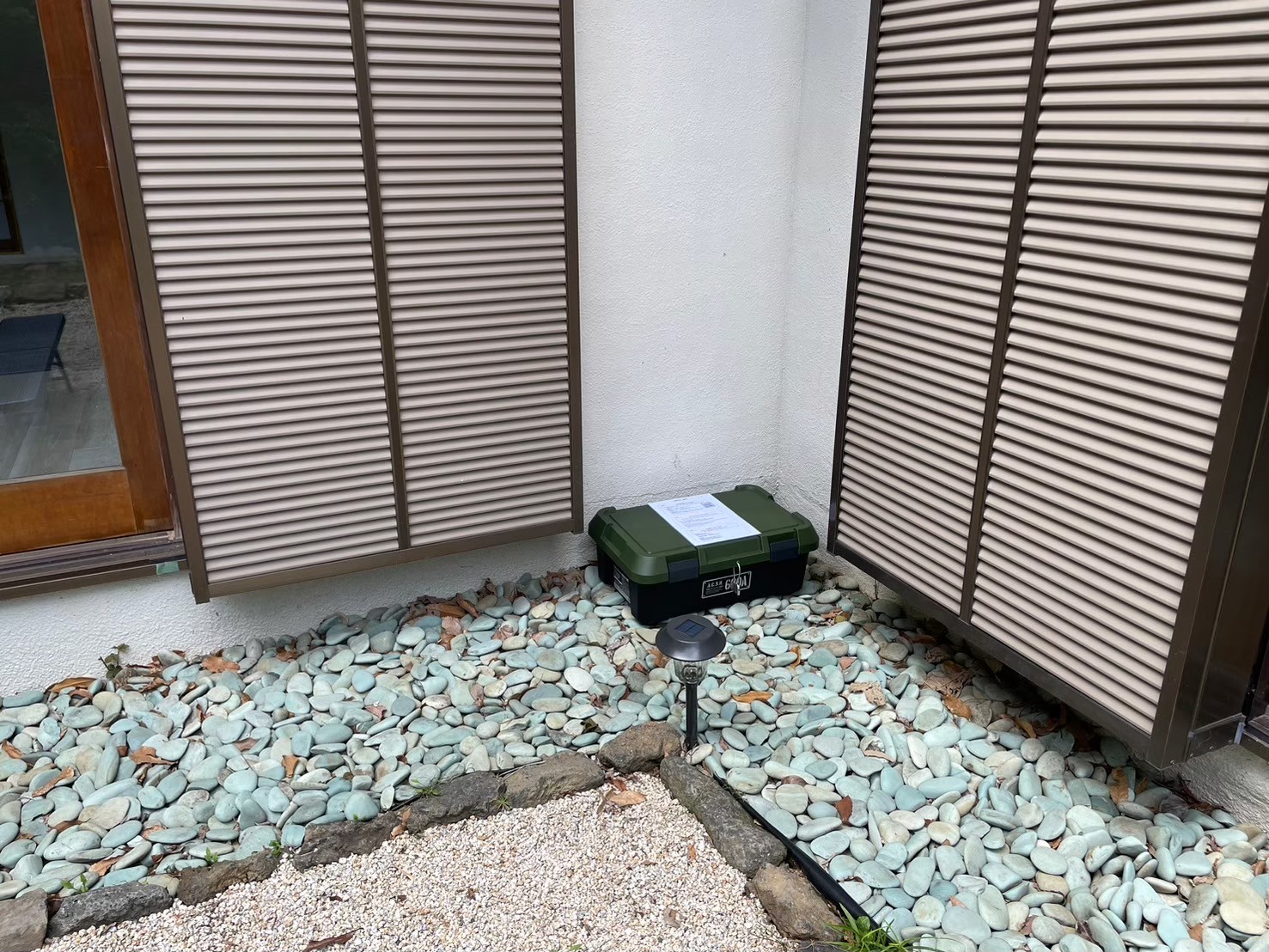 玄関付近にルーター・モデムがあります。両方とも電源を抜いてください。その後、モデム(黒い機械の方)から電源を入れていただき、5分後にルーター(白い機械)の電源を入れてください。