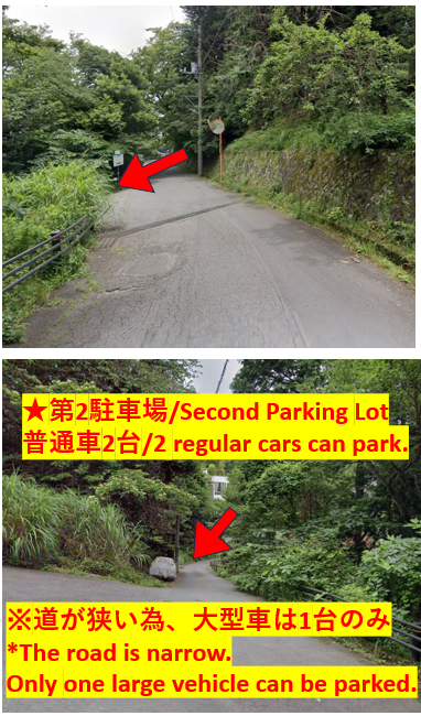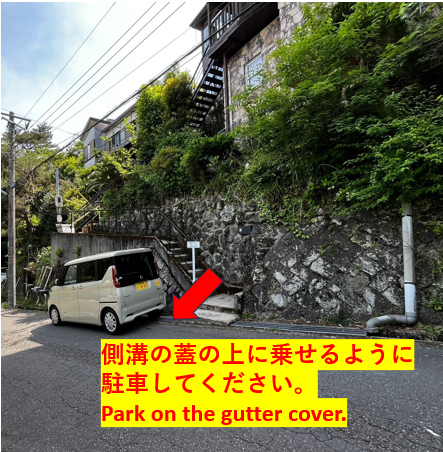 駐車場に停めきれない場合、建物に繋がる階段横に1台駐車可能です。画像の通り、交通の妨げにならないよう側溝の蓋の上に乗るように端に寄せて駐車してください。