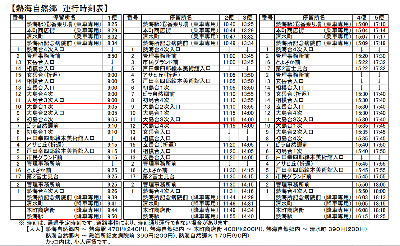 徒歩3分ほどの場所に「大島台3次入口」というバス停があります。熱海駅→自然郷の循環バスで1日5便ほど運行しており、熱海駅まで30~50分でアクセスできます。(乗車時間により所要時間が異なります。)