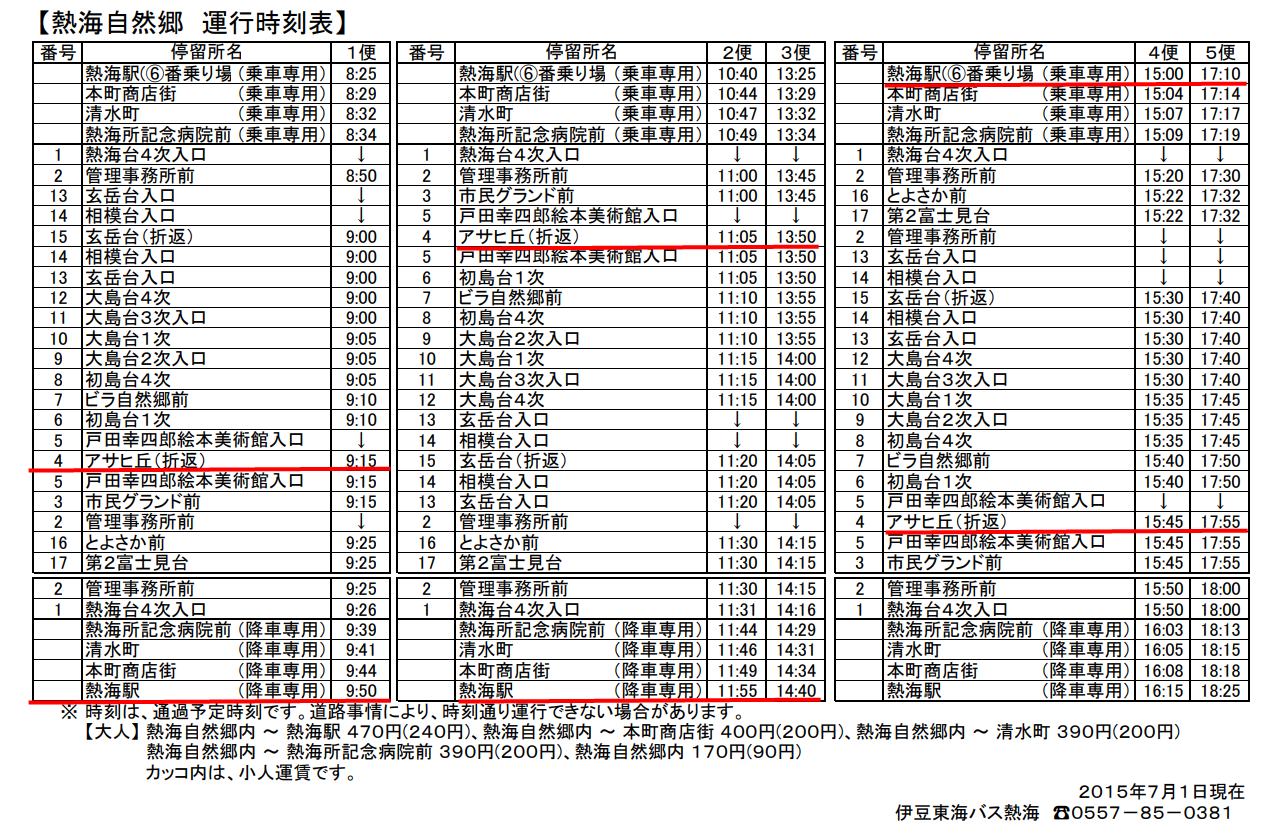 徒歩2分程の場所に「アサヒ丘」というバス停がございます。1日5便ほど運行しており、熱海駅まで30~50分でアクセスできます。(乗車時間により所要時間が異なります。)