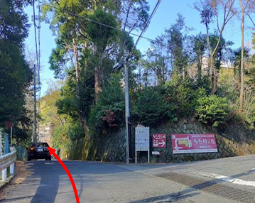 2️⃣②200m程進むと左側に坂があります。こちらを左折後、道なりに進みます。