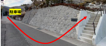 5️⃣駐車場から徒歩30秒程の場所に階段があります。こちらの階段をお進みください。